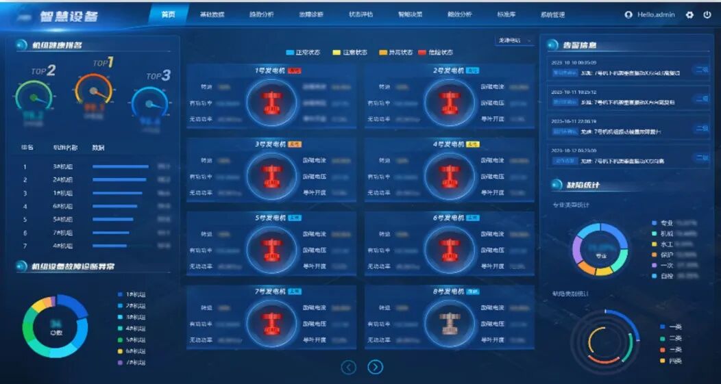 “故障特征库+专家知识图谱”双轮驱动,搭配“大模型+小模型”协同发力,不仅能动态评估设备健康指数(HI),更能实现故障根因的精准溯源。内置17种专业诊断图谱,覆盖水电机组99%以上故障类型,让故障标准化、根因清晰化。针对水电机组,开发1个趋势预测模型、8个预警模型及33个故障诊断模型,真正实现“故障早发现、根因早找到、隐患早消除”。