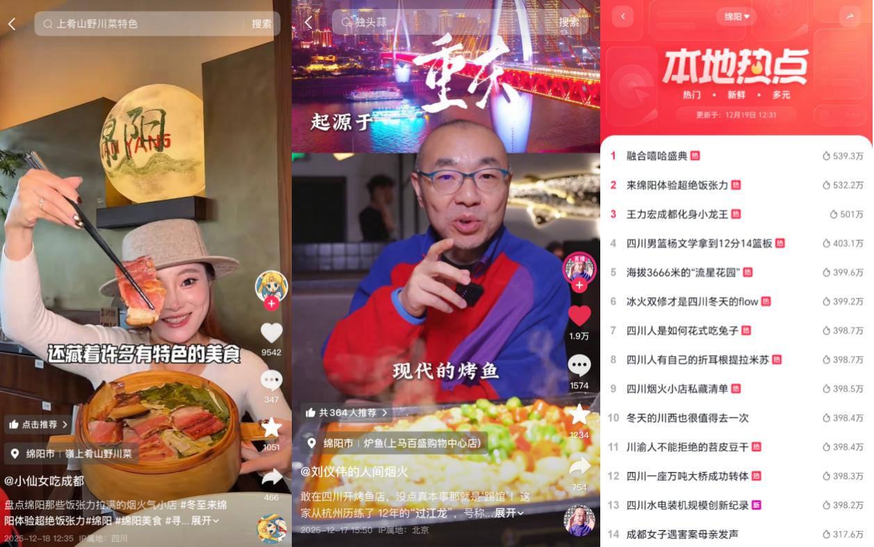 在绵阳,食物以麻辣鲜香为基调,既有着市井小吃的质朴,也有地方特色菜的鲜醇满足感。冬至前夕,达人@小仙女吃成都 循着香气深入绵阳街巷,带大家逛吃地道风味,感受绵阳菜的“超绝饭张力”;美食家@刘仪伟 也奔赴当地特色烤鱼店「炉鱼」,品鉴海鱼鲜美与川味烤制工艺的奇妙融合,领略绵阳美食海纳百川的多元魅力。
