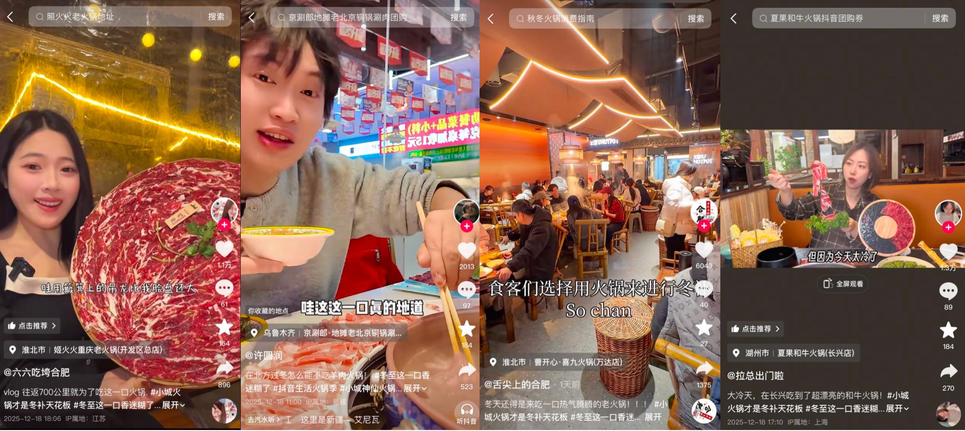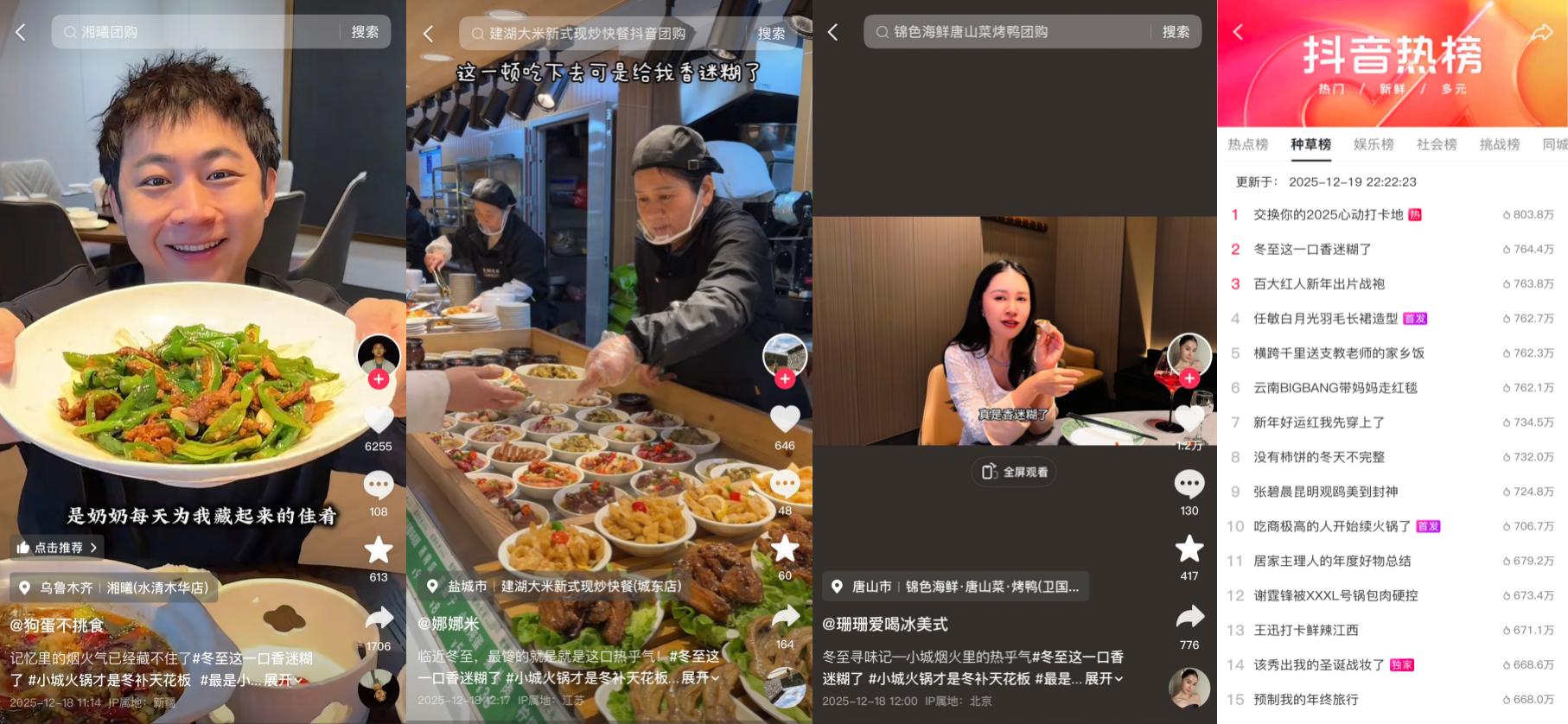 乌鲁木齐湘曦里,达人@狗蛋不挑食 邂逅湘味热辣,体验跨越南北的冬日美味;@娜娜米 打卡江苏盐城建湖大米·新式现炒快餐,从锅气满满的新鲜热炒里,品味盐城“因盐而生”的饮食底蕴;福建宁德的组个局·海鲜·烧烤·音乐酒馆中,@叶叶不回家 正撸串、喝酒、听着民谣,开启冬至狂欢;还有唐山锦色烤鸭店里把油嫩鸭皮混着葱丝黄瓜,一起卷进薄面皮里的@珊珊爱喝冰美式,扬州永安水煮活鱼店里正对着一盆水煮鱼大快朵颐的@孙小瓜……天南地北的达人们,用各自的方式,拼出了冬至与跨年的暖心美食打卡合集。