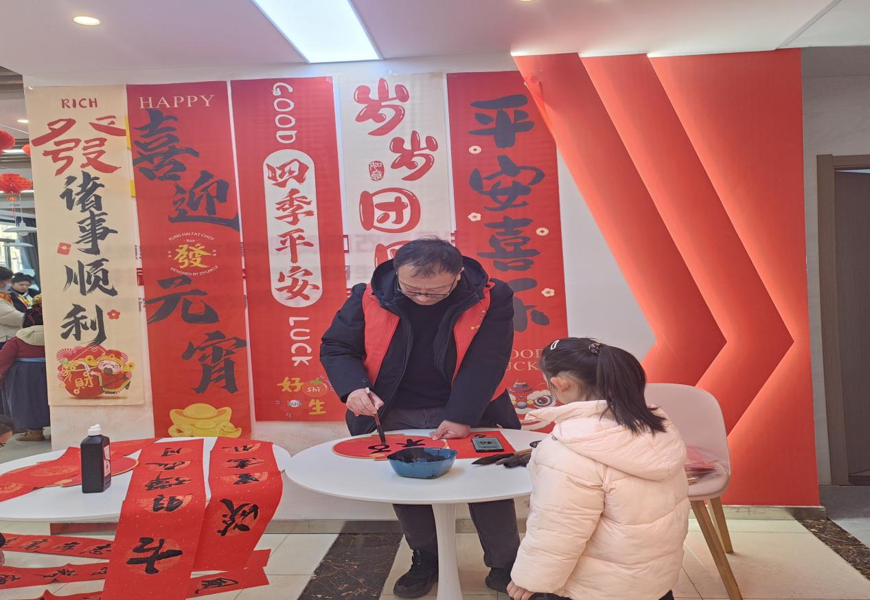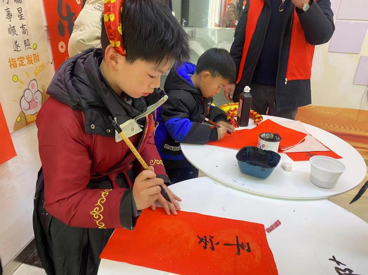 在 “墨香迎春” 区域,书法老师俯下身,耐心地指导孩子们与家长握笔姿势,一撇一捺间,饱含对新年的期许,每一个笔画都彰显着大家对传统文化的热爱。